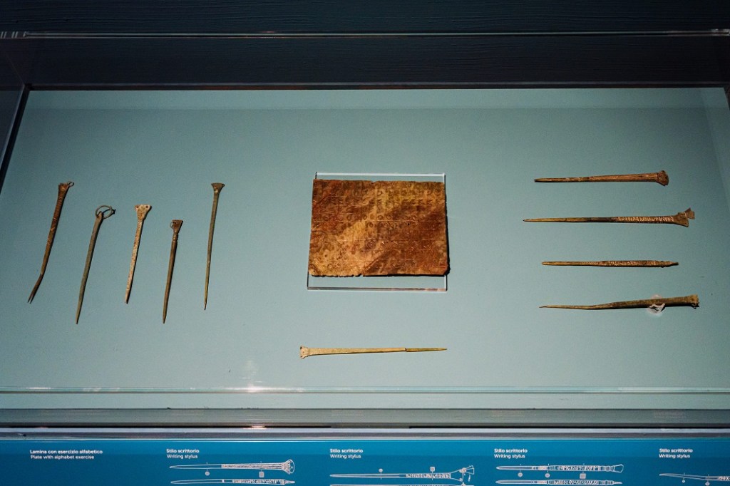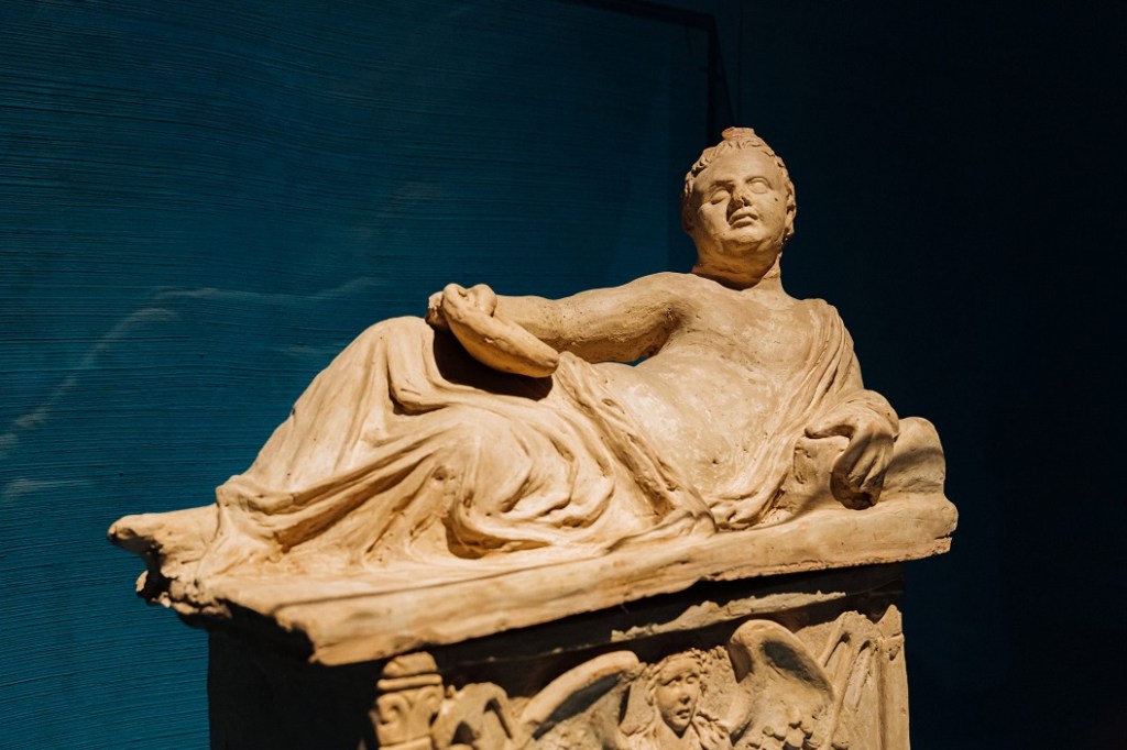 Luogo di transito e punto di riferimento della comunità che unisce la cura, fisica e spirituale, ad una sofisticata ricerca idraulica, applicata al territorio: una “devozione ingegneristica” sottolineata dalla presenza di Dedalo in una decorazione acroteriale. Una figura la sua, che in Etruria padana assume uno speciale significato proprio per le sue capacità ingegneristiche nella gestione delle acque, e che grazie ad un’unica antefissa superstite documenta il raffinato apparato di decorazione del tetto dell’edificio sacro. La sezione etrusca si chiude con Adria e Spina, porti dell’Adriatico settentrionale, dove frammenti iscritti e reperti votivi restituiscono pratiche rituali legate alla navigazione e agli approdi sacri.