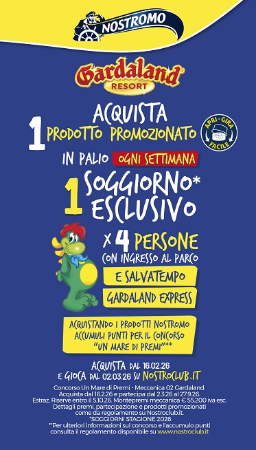 Dopo il successo dello scorso anno, torna il grande concorso “Gardaland: Un Mare di Divertimento”. Fino al 27 settembre 2026, acquistando una confezione di Tonno Nostromo Una Goccia d’Olio, si potrà vincere ogni settimana un soggiorno per 4 persone nell’esclusivo Resort Gardaland Adventure con accesso al celebre parco dei divertimenti, per vivere da protagonisti le sue attrazioni più emozionanti. Nostromo rinnova inoltre la personalizzazione della Colorado Boat, una tra le attrazioni più apprezzate di Gardaland.