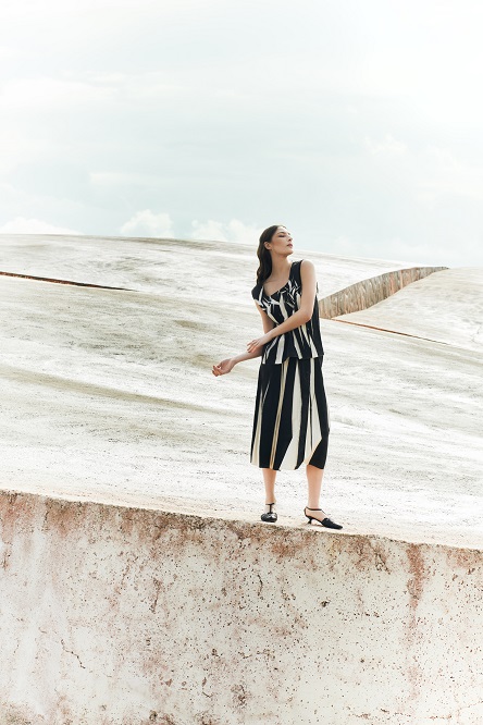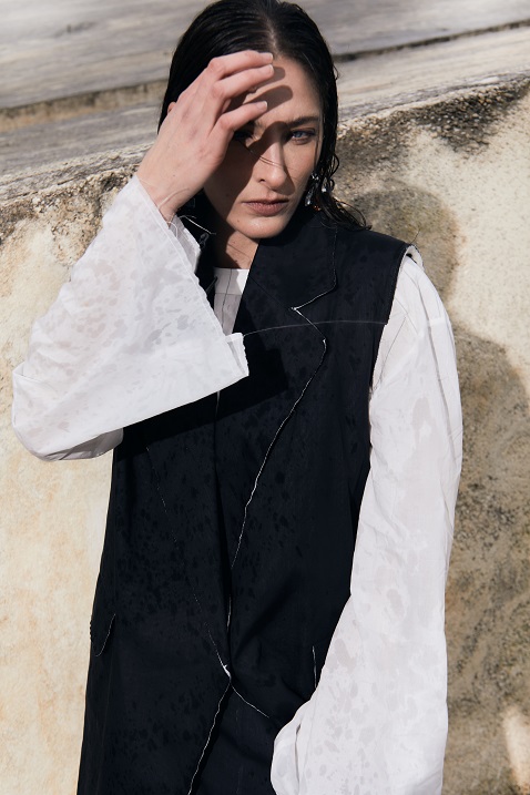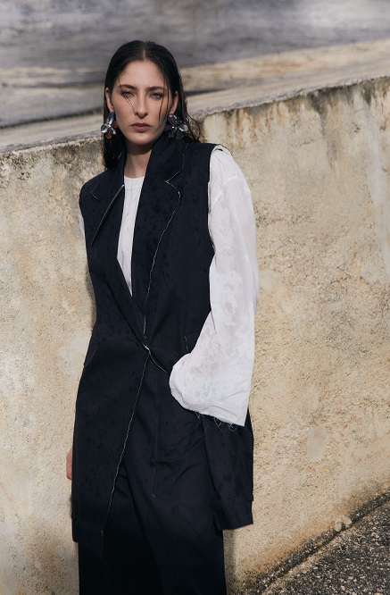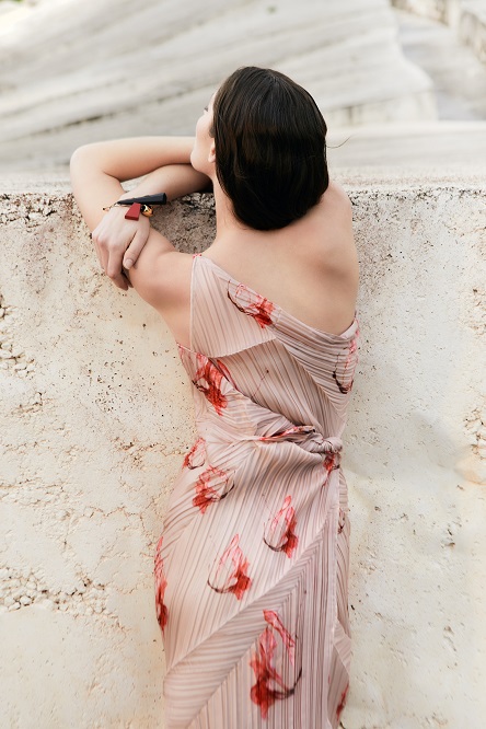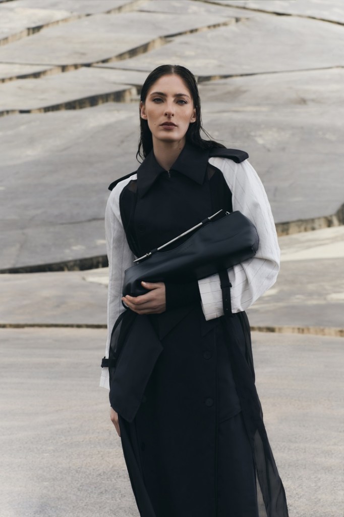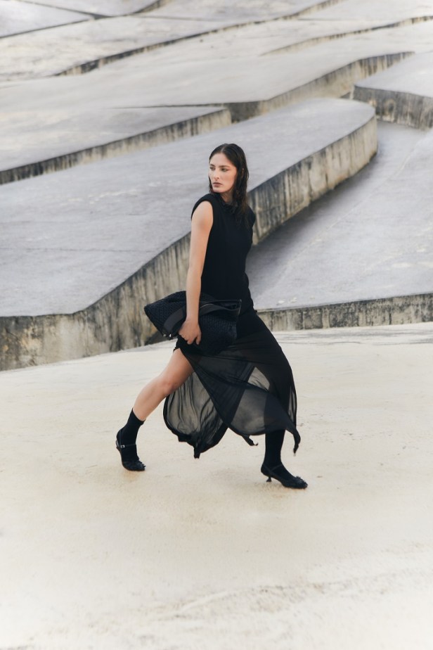 I capi, sia strutturati che fluidi, sono pensati per accompagnare il movimento con naturalezza. Le gonne e gli abiti dal ginocchio in giù si presentano in una palette neutra, arricchita da incursioni di colore e dettagli sparsi. La leggerezza è protagonista: tessuti eterei, trasparenti e delicati si combinano con una ricerca di volumi più avvolgenti e proporzioni inedite.