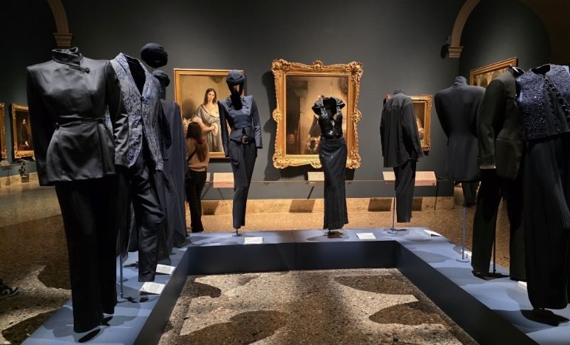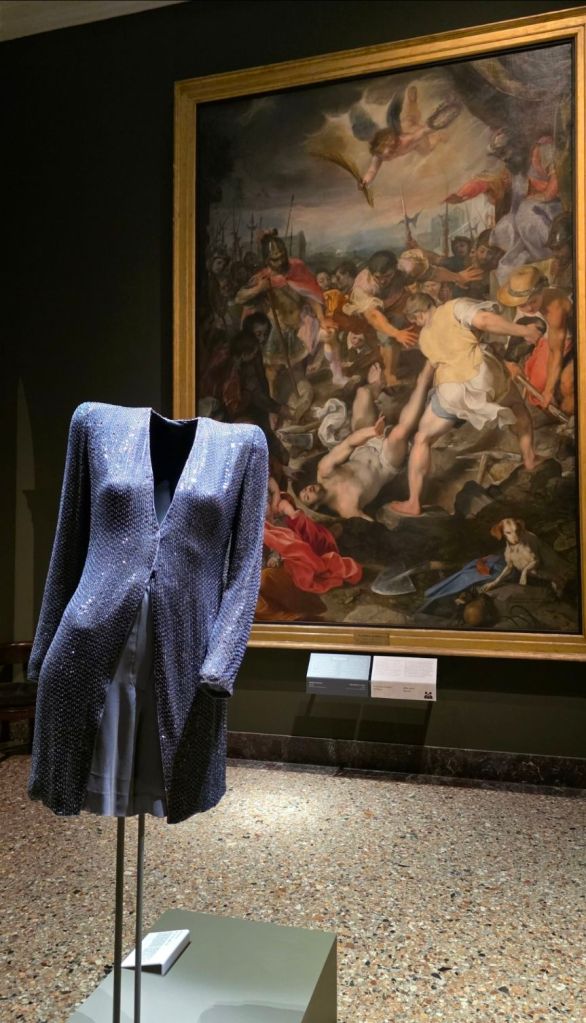 Questi accostamenti funzionano perché vanno oltre la superficie. La mostra costruisce un sistema di relazioni basato su colore, forma e materia. Anche gli accostamenti in velluto nero degli abiti richiama i chiaroscuri della pittura barocca, le sete luminose dialogano con le velature dell’olio su tela, le linee pulite di Armani trovano eco nelle composizioni geometriche dei maestri rinascimentali.