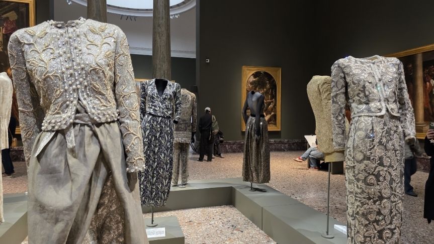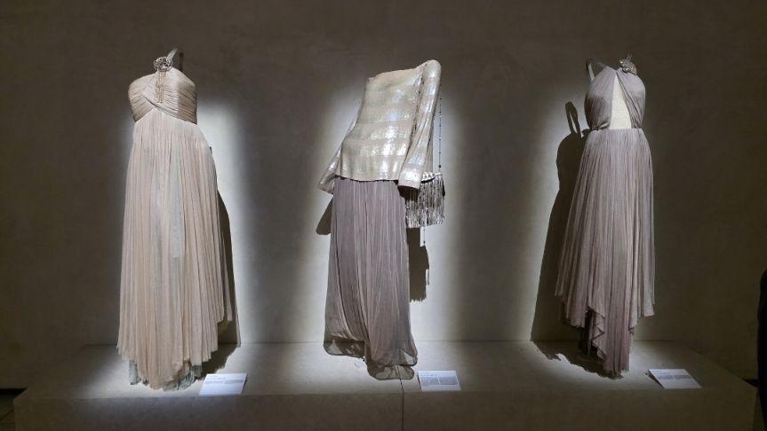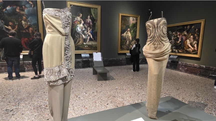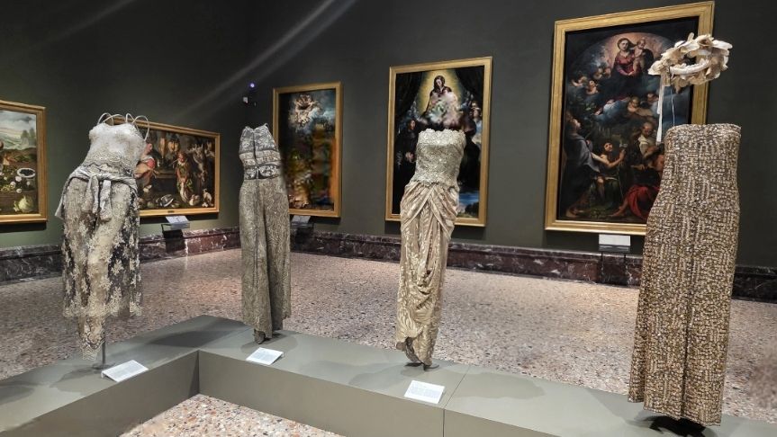 Camminando tra le sale, si ha la sensazione che il museo cambi ritmo. Gli abiti, spesso sospesi su supporti invisibili, sembrano galleggiare nello spazio, come apparizioni leggere. Non occupano le stanze, ma le abitano con rispetto, cercando un dialogo continuo con le opere.