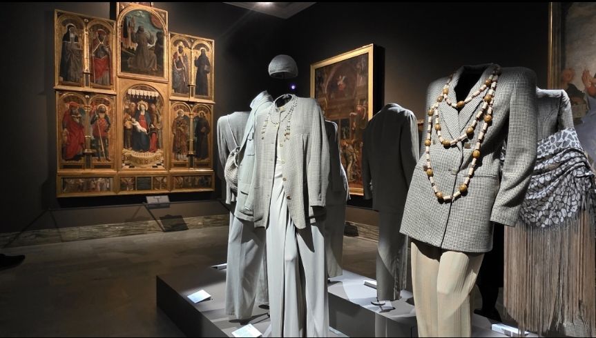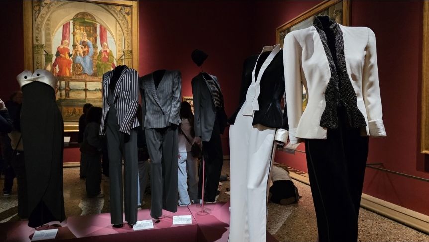 Ed è proprio in questo dialogo che la mostra trova la sua forza. Non si tratta di accostamenti casuali, ma di vere e proprie risonanze. Il celebre completo grigio di American Gigolo (1980), indossato da Richard Gere, immagine-simbolo della moda maschile Armani, con la sua costruzione impeccabile e le linee essenziali, esposto vicino agli affreschi di Donato Bramante, sembra riflettere la solidità delle architetture rinascimentali. Poco più avanti, l’abito blu indossato da Juliette Binoche al Festival di Cannes del 2016 richiama immediatamente le tonalità profonde dl blu della pittura sacra della “Madonna col Bambino” di Giovanni Bellini, creando un ponte visivo ed emotivo tra epoche lontane.