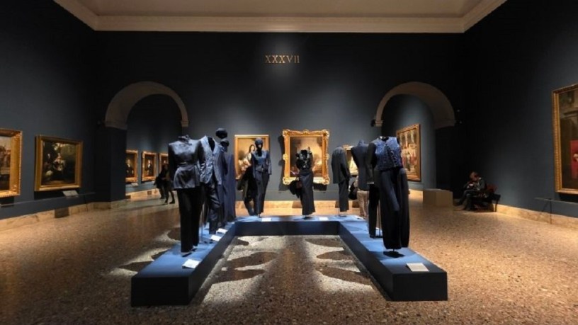 Ed è proprio in questo dialogo che la mostra trova la sua forza. Non si tratta di accostamenti casuali, ma di vere e proprie risonanze. Il celebre completo grigio di American Gigolo (1980), indossato da Richard Gere, immagine-simbolo della moda maschile Armani, con la sua costruzione impeccabile e le linee essenziali, esposto vicino agli affreschi di Donato Bramante, sembra riflettere la solidità delle architetture rinascimentali. Poco più avanti, l’abito blu indossato da Juliette Binoche al Festival di Cannes del 2016 richiama immediatamente le tonalità profonde dl blu della pittura sacra della “Madonna col Bambino” di Giovanni Bellini, creando un ponte visivo ed emotivo tra epoche lontane.
