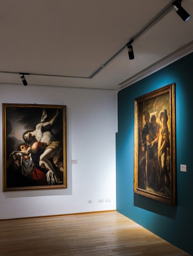 Una prima sezione documenta l’influenza a Napoli delle opere di Caravaggio e l’affermarsi della corrente naturalista con dipinti degli artisti che per primi recepirono il portato del luminismo caravaggesco e la sua nuova interpretazione dei soggetti sacri, e con la determinante presenza dal 1616 dello spagnolo Jusepe de Ribera. Nella seconda sezione, un gruppo di tele, realizzate tra la metà degli anni Trenta e gli anni Cinquanta del Seicento, documenta la vivacità e la molteplicità di presenze artistiche della scena napoletana e i modi peculiari nei quali artisti di formazione naturalista recepirono varie influenze, dovute anche alla presenza di pittori di diversa provenienza attivi nei maggiori cantieri artistici della città. Fra queste opere un nucleo testimonia anche l’affermarsi, verso la metà del Seicento, di una produzione di quadri di “figure in piccolo”, richiesti dal collezionismo privato, con rappresentazioni di martirii di santi, ma anche di episodi di cronaca contemporanea o scene profane. Un altro nucleo ci permette invece di focalizzare soggetti con protagoniste femminili, molto presenti nella devozione partenopea. La terza sezione è dedicata alla Natura morta, genere che a Napoli ebbe una peculiare affermazione di matrice caravaggesca con la formazione di una vera e propria scuola di pittori che riscossero grande successo, ben oltre l’ambito partenopeo. L’ultima sezione documenta gli sviluppi verso il barocco, avviati dalla metà del Seicento con l’arrivo in città di Mattia Preti nel 1653 e l’affermazione di Luca Giordano, artisti di grande fama, entrambi rappresentati in collezione con opere importanti.