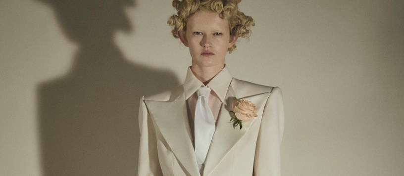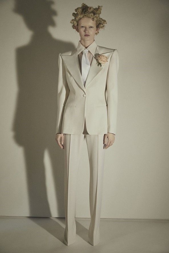 Il look scelto dall’attrice è un tuxedo bianco in crêpe de chine, pezzo manifesto della collezione che rielabora i codici del tailoring maschile attraverso una lente iper-femminile.