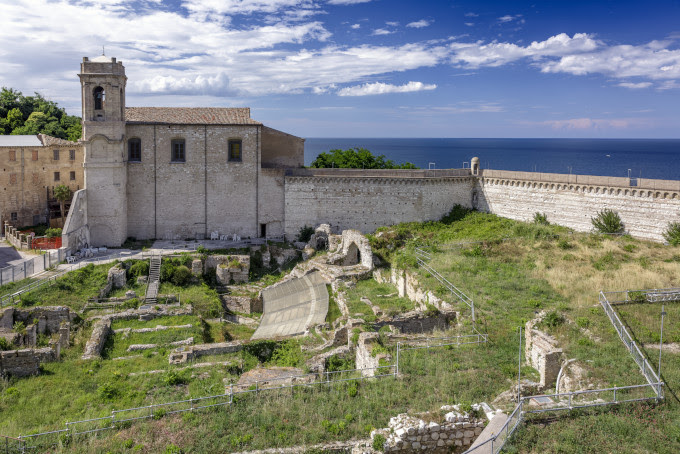 La passeggiata ridiscende poi verso il centro cittadino, toccando la Chiesa di San Domenico, imponente edificio settecentesco progettato da Carlo Marchionni, con opere di grande rilievo come l’Annunciazione del Guercino, e la Chiesa di Santa Maria della Piazza, autentico gioiello romanico costruito sopra resti paleocristiani e greci, dove mosaici, sculture simboliche e tracce medievali si sovrappongono in un racconto affascinante.