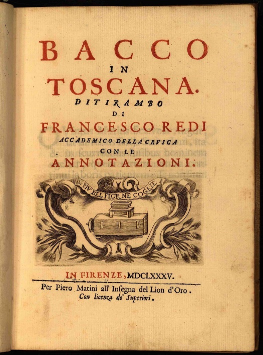Redi, oltre ad essere medico e scienziato, fu anche letterato, scrittore e poeta dai gusti raffinati. Seppe coniugare, in una sintesi raramente ripetibile, le cosiddette ‘ due culture’: la passione per la ricerca scientifica con l‘estro fantastico delle belle lettere e il gusto umanistico della lingua con il rigore del procedimento sperimentale. Una delle sue opere più celebri è il Bacco in Toscana, componimento del Redi in cui elogiava il vino della regione.