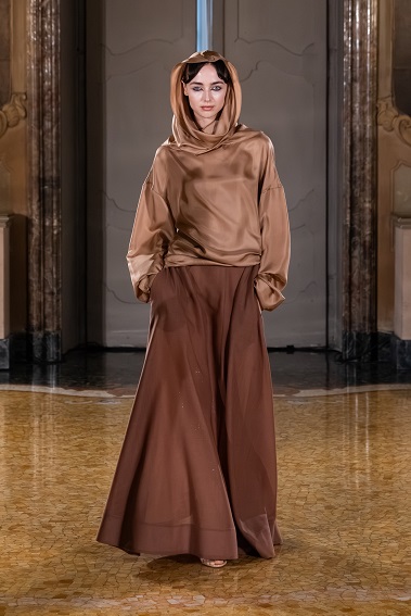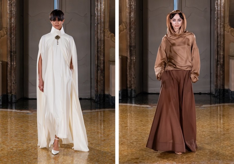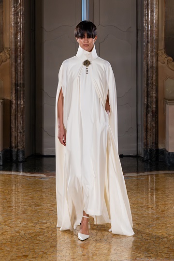 Iconica, la cappa in bianco ottico diventa simbolo di purezza e presenza. Il collo a imbuto amplifica la figura, mentre il drappeggio costruito cattura la luce in un gioco di riflessi e ombre, evocando connessione e relazioni. L’hoodie, reinterpretato in chiave sofisticata, elimina ogni riferimento street per diventare gesto di lusso consapevole, elegante e inclusivo.