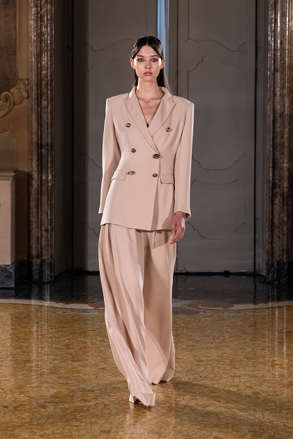 La materia è linguaggio universale: l’opacità del crêpe di lana dialoga con la brillantezza fluida del satin di seta, creando una tensione visiva e tattile che seduce senza ostentazione. Gli accessori — bottoni araldici, spille a rosa del deserto, cinture metalliche — scandiscono la composizione, segnando ritmo, eleganza e armonia tra elementi diversi.