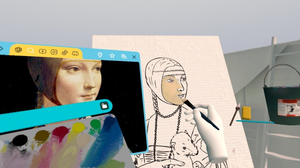 Dopo aver indossato il visore, entriamo in un atelier virtuale tra cavalletto, tela e strumenti artistici. Grazie a una simulazione realistica proviamo a impugnare pennelli di diverse dimensioni e a miscelare i colori per reinterpretare un’opera pittorica o una sua macchina e viviamo un’esperienza immersiva che unisce arte, tecnica e immaginazione ispirandosi al processo creativo di Leonardo.