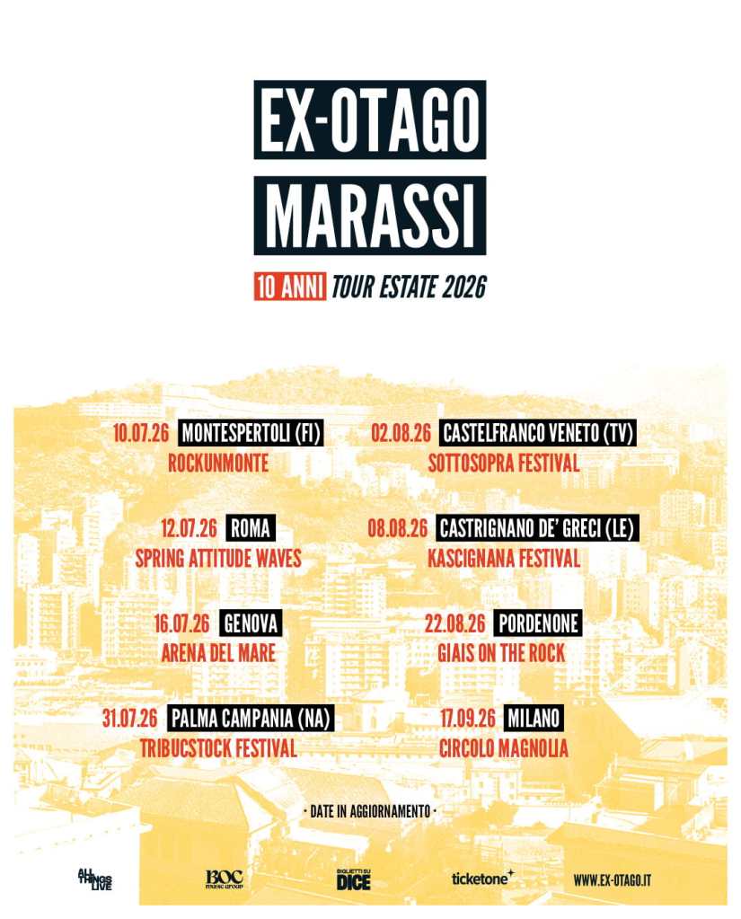 Gli Ex-Otago si formano a Genova nel 2002 come trio acustico e sono tra le prime band a esplorare il suono indie pop d’oltreoceano e a sposarlo alla canzone italiana. Per i primi cinque minuti di vita si sono chiamati Otago, omaggio al nome di una squadra di rugby neozelandese che vinse il campionato contro ogni pronostico, ma poi il nome non li convinceva più, quindi si sono dovuti sciogliere e riformare – giustappunto - come Ex-Otago. Da quel momento sono passati oltre vent’anni: anni in cui la band ha attraversato cambi di formazione e si è confrontata con un pubblico sempre più ampio, continuando a evolversi pur restando fedele a un linguaggio personale e riconoscibile. Dopo l’esordio con “The Chestnuts Times” (2002), seguito da “Tanti saluti” (2007), con “Mezze Stagioni” (2011) è arrivata la consacrazione come nome cult della scena underground. Dopo essere stati “In capo al mondo” (2014), la band torna – letteralmente – a casa con “Marassi” (2016). Prodotto da Matteo Cantaluppi, l’album raccoglie gli entusiasmi di pubblico e critica (è certificato disco d'oro, con Quando sono con te singolo di platino e La nostra pelle singolo d'oro) e li conferma come uno dei capisaldi del mondo indie italiano, come li ha definiti Rolling Stone. Il disco è stato poi ripubblicato l’anno successivo in una versione Deluxe con il coinvolgimento di vari artisti tra cui rapper come Jake La Furia, Caparezza e Willie Peyote, anticipando la commistione tra itpop e rap che ha dominato le classifiche negli ultimi anni. Dopo un lungo tour, che tra le varie tappe li ha portati anche a condividere il palco con i Radiohead, nel 2019 la band partecipa al festival di Sanremo con “Solo una canzone” (certificata singolo d’oro), a cui fa seguito la pubblicazione del sesto album in studio, “Corochinato!”. Dopo un periodo di pausa, nel 2023 hanno pubblicato l’album “Auguri” e sono tornati ad attraversare il Paese con il loro canzoniere fatto ormai interamente di classici del pop d’autore. Nel gennaio 2026 celebrano il decennale di Marassi con un tour nei piccoli club tour di tutta Italia che registra il sold out immediato, e con Euromarassi, una serie di date in Europa ad aprile. La festa ripartirà in estate con un tour nei migliori festival italiani e che passa dalla loro Genova a luglio.