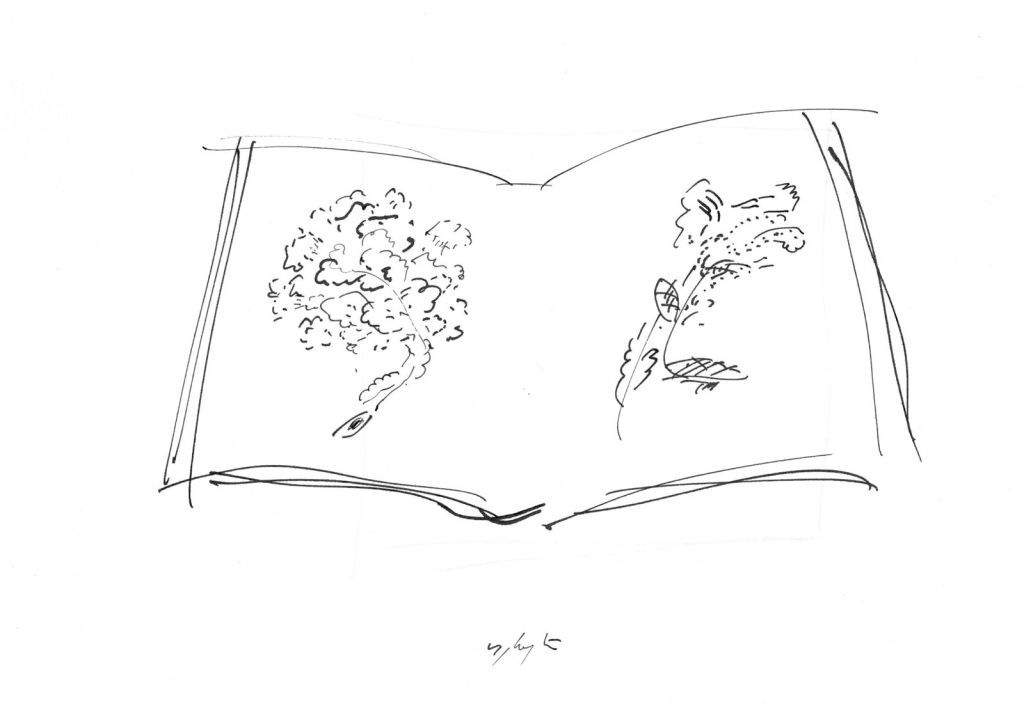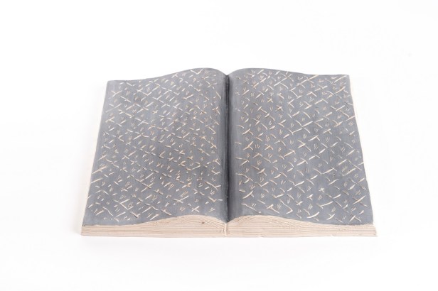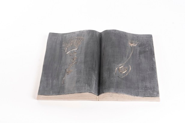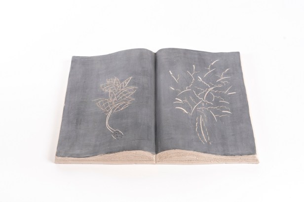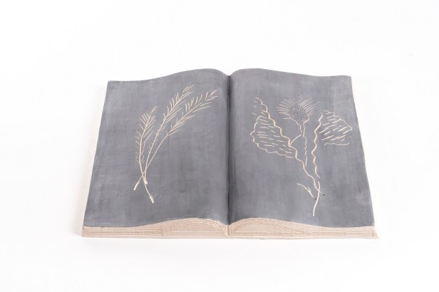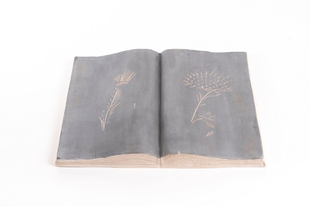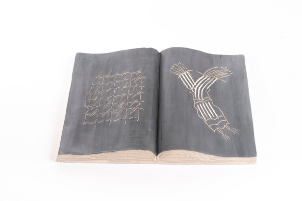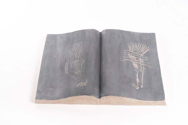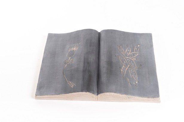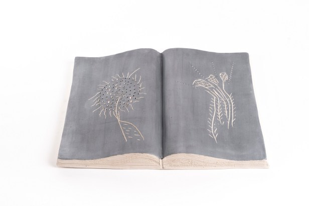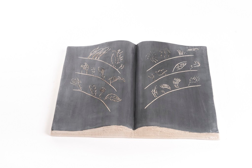 Libri aperti in ceramica ingobbiata e incisa dall’autore nel laboratorio Ceramiche Puzzo, Milano