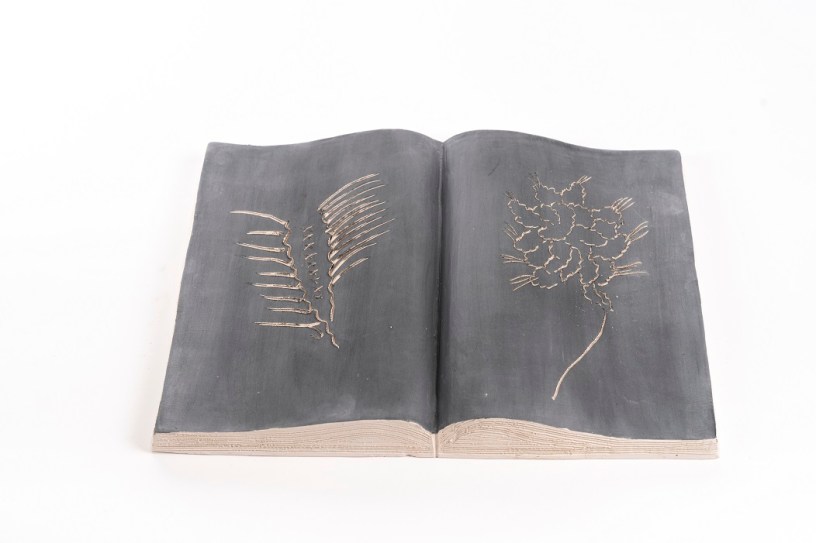 Libri aperti in ceramica ingobbiata e incisa dall’autore nel laboratorio Ceramiche Puzzo, Milano