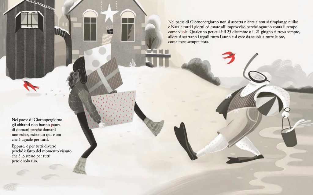 “Nel paese di Giornopergiorno” è una fiaba poetica che affronta con delicatezza temi complessi, come il tempo che scorre, l’attesa, la perdita e le separazioni, ma anche il valore del presente, le relazioni affettive, la crescita, il cambiamento, la capacità e possibilità di ricominciare sempre.