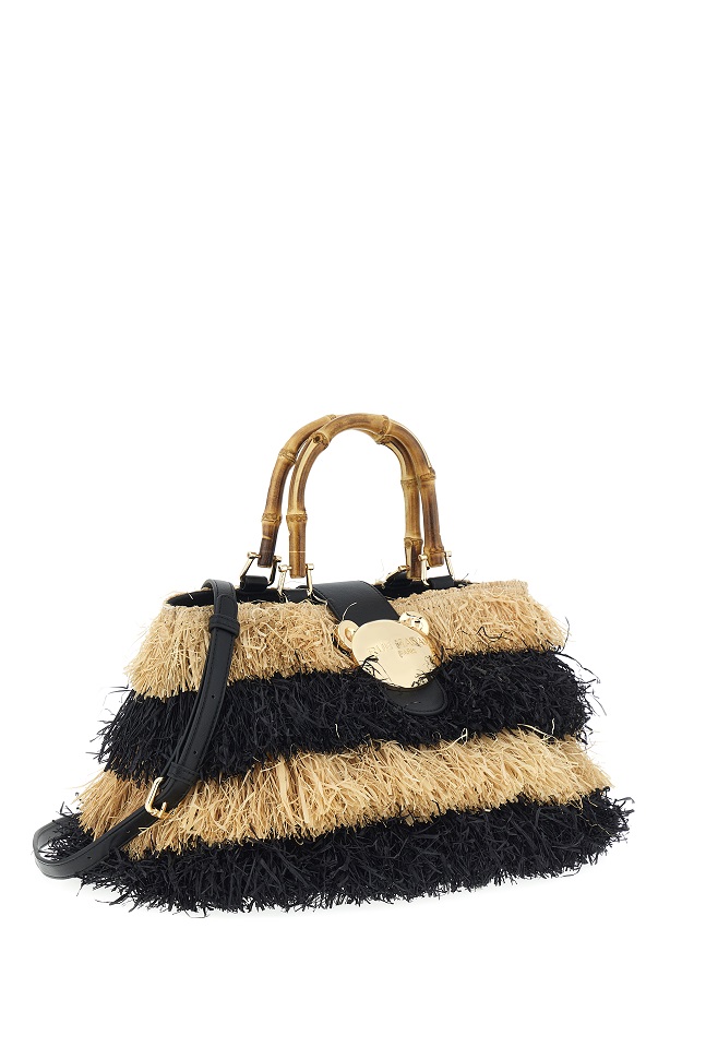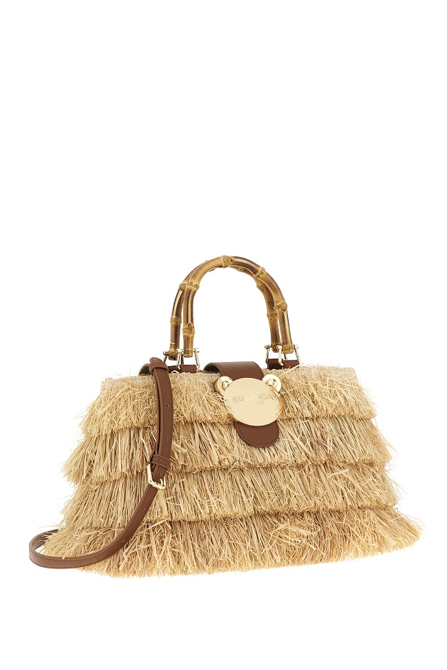 Frange naturali, manici in bamboo e l’iconica chiusura orsetto per uno stile audace e raffinato.