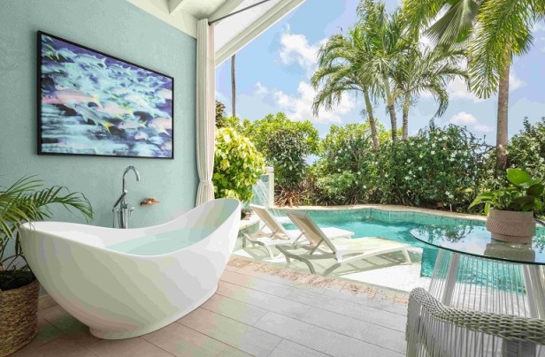 Molte sistemazioni sono dotate delle iconiche Tranquility Soaking Tubs, posizionate su balconi, terrazze private o patii immersi nel verde: veri e propri angoli all’aperto dove rallentare, lasciarsi avvolgere dal paesaggio caraibico e vivere momenti di quiete, tra il suono del mare e la vegetazione tropicale, sorseggiando un bicchiere di vino.