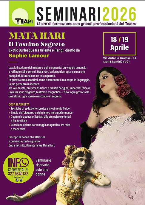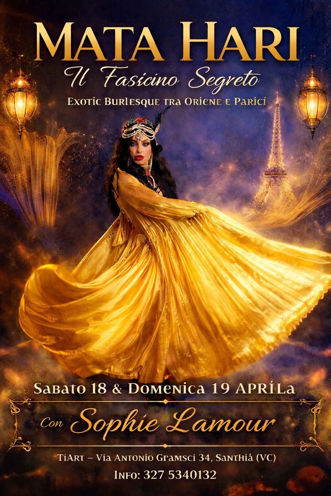 Sabato 18 e domenica 19 aprile a Santhià, in provincia di Vercelli, Sophie Lamour terrà un seminario dal titolo “MATA HARI – Il Fascino Segreto”, l’occasione per lasciarsi sedurre dal mistero e dalla leggenda.