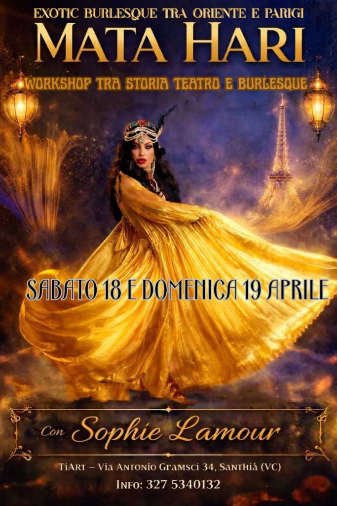 “MATA HARI – Il Fascino Segreto” è un seminario intensivo di exotic burlesque che accompagna le partecipanti in un viaggio sensuale, raffinato e profondamente evocativo sulle orme di Mata Hari — danzatrice, spia e icona senza tempo, capace di incantare l’Europa con un solo sguardo.