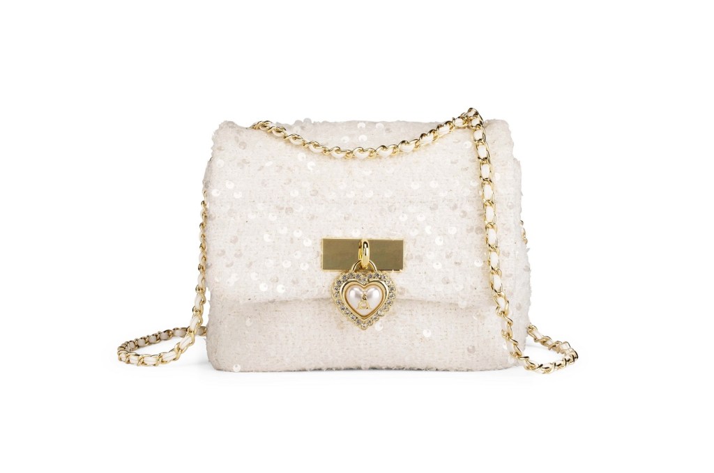Chiude la collezione LINNIE, la proposta più romantica e preziosa: una bag ricoperta di paillettes e arricchita da charms a cuore, disponibile nelle delicate nuance white e rosa. Un accessorio che interpreta con eleganza il lato più sognante delle occasioni speciali.