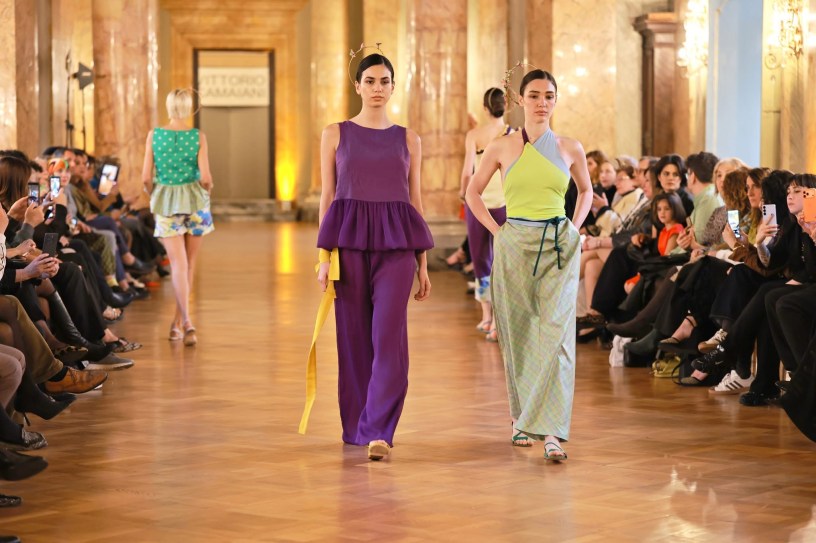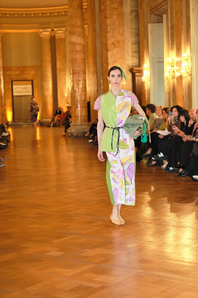 Nella parte di collezione dedicata all’Oceania il continente viene rappresentato in colori come il viola, il verde, il giallo, le fantasie floreali come fossero pennellate di Gauguin, su linee balloon di top in lino e chiffon, su pantaloni in lino dalla foggia morbida e su lunghe gonne in taffetà. Il make-up delle modelle realizzato da Vivi Make-up Academy segue la palette cromatica della collezione, mentre i fiori intrecciati negli chignon sono realizzati da Compagnia della Bellezza.