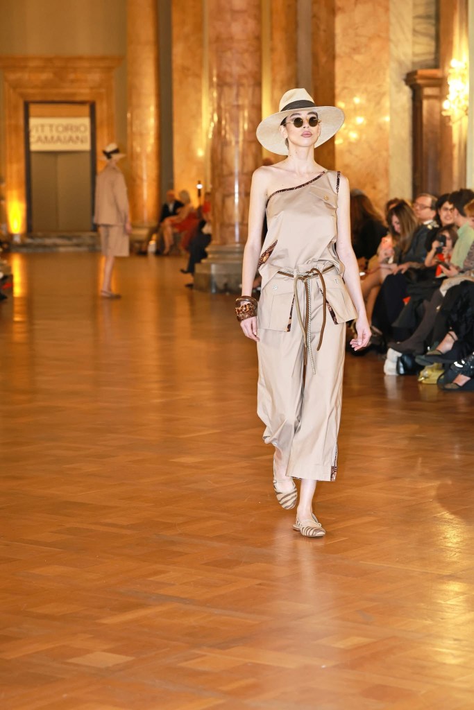 La dedica all’Africa vede mescolate le tipiche fantasie africane allo stile coloniale con le tasche applicate o in trasparenza come leitmotiv e la palette cromatica vira verso le nuances terra dei marroni, dei beige, del fango e dell’ocra su organza in seta, lini e cotone batik e ai piedi non possono poi mancare sabot a stampa animalier realizzati magistralmente da Lella Baldi su disegno di Vittorio Camaiani.
