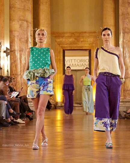 In America invece Camaiani sceglie di omaggiare l’America del jeans e della comodità o comunque una dimensione più vacanziera, con i colori della sua bandiera riportati sui capi, con stelle a decorare il denim dei pantaloni e ancora shorts, bermuda, tute abbinate a polo sciolte e camicie in seta strizzate in vita da foulard.