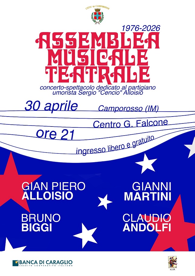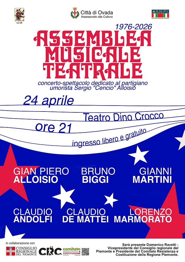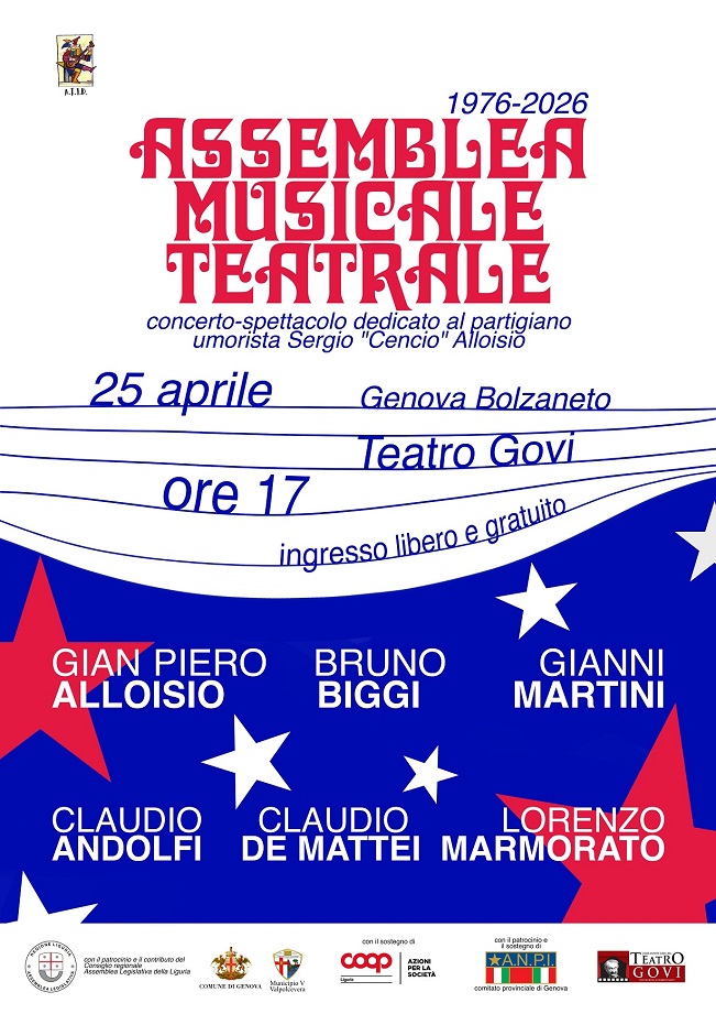 ASSEMBLEA MUSICALE TEATRALE - XXI Festival Pop della Resistenza Concerto-spettacolo dedicato al partigiano Sergio "Cencio" Alloisio Ingresso libero e gratuito OVADA (AL) Venerdì 24 aprile 2026 Teatro Comunale Dino Crocco ore 21 Al termine dello spettacolo, i saluti di Domenico Ravetti (Vicepresidente del Consiglio Regionale del Piemonte e Presidente del Comitato Resistenza e Costituzione) e dell'Amministrazione comunale di Ovada. Lo spettacolo è coorganizzato da ATID con il Comune di Ovada (Assessorato alla Cultura) e la sezione ANPI "Paolo Marchelli" di Ovada, nell'ambito delle Celebrazioni per l'81° anniversario della Liberazione, ed è realizzato in collaborazione con il Comitato Resistenza e Costituzione del Consiglio Regionale del Piemonte GENOVA-BOLZANETO Sabato 25 aprile 2026 Teatro Govi ore 17 Il coinvolgimento delle nuove generazioni: in occasione dello spettacolo, sarà presentato il progetto del Comitato provinciale dell’ANPI di Genova che affida alle scuole superiori la registrazione di interviste a figli e nipoti di partigiani. L’evento, prodotto da ATID, ha il patrocinio e il sostegno del Consiglio Regionale - Assemblea Legislativa della Liguria, del Municipio V Valpolcevera, di ANPI Comitato provinciale Genova, il sostegno di Coop Liguria e la collaborazione del Teatro Rina e Gilberto Govi CAMPOROSSO (IM) Giovedì 30 aprile 2026 Centro Polivalente Giovanni Falcone ore 21 Lo spettacolo, prodotto da ATID, è realizzato con il sostegno del Comune di Camporosso e il contributo della Banca di Caraglio, del Cuneese, della Riviera dei Fiori Credito Cooperativo