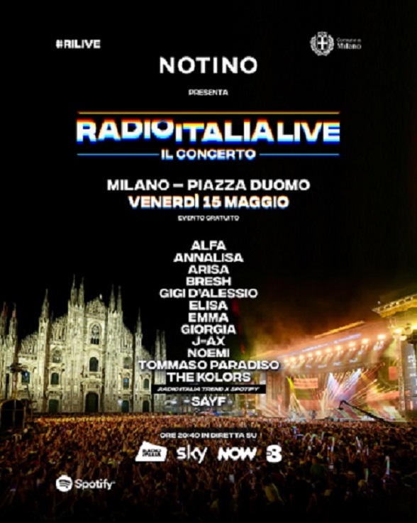 RADIO ITALIA LIVE – IL CONCERTO torna in Piazza Duomo a Milano venerdì 15 maggio alle ore 20.40. Il più grande evento gratuito di musica live in Italia, che si svolgerà quest’anno anche al Foro Italico di Palermo il 28 giugno, organizzato da Radio Italia e realizzato grazie alla collaborazione con il Comune di Milano, vede protagonisti sul palco, accompagnati dalla Radio Italia Live Orchestra diretta dal M° Bruno Santori: ALFA, ANNALISA, ARISA, BRESH, GIGI D’ALESSIO, ELISA, EMMA, GIORGIA, J-AX, NOEMI, TOMMASO PARADISO, THE KOLORS. A Radio Italia Trend x Spotify: SAYF.