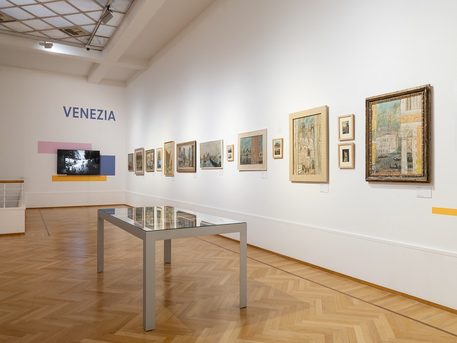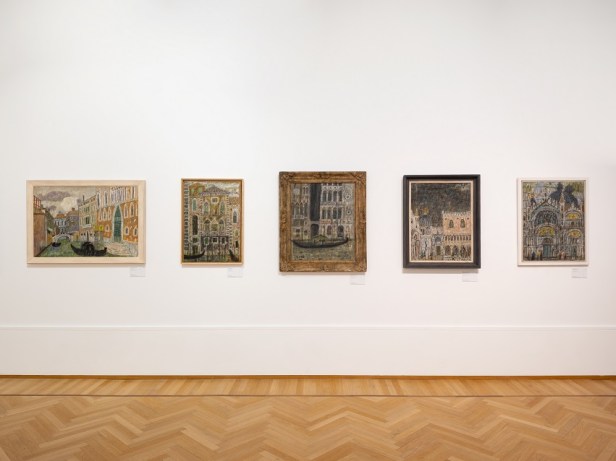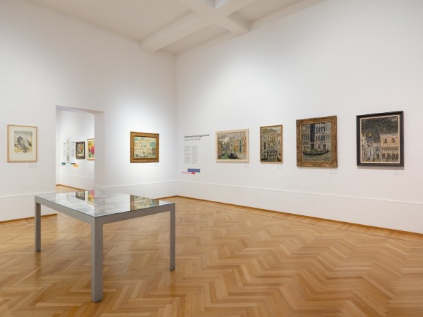 Il percorso si conclude con la quinta sala, dedicata a Venezia. Nella città lagunare l’artista sviluppa, dalla fine degli anni Quaranta, un linguaggio pittorico autonomo per rappresentare la città. Qui intreccia rapporti con la scena artistica locale e internazionale, tra cui Filippo de Pisis, Peggy Guggenheim e Zoran Mušič. Una sezione è dedicata anche alla tecnica pittorica dell’artista e mostra come egli utilizzasse cartoline come modelli di lavoro. In queste pratiche emergono ancora riferimenti ai metodi artistici appresi durante il periodo di studio al Bauhaus. La partecipazione alla Biennale di Venezia del 1948 e del 1950 è documentata attraverso diversi materiali d’archivio, tra cui lettere di Giorgio de Chirico e Jean Cocteau.