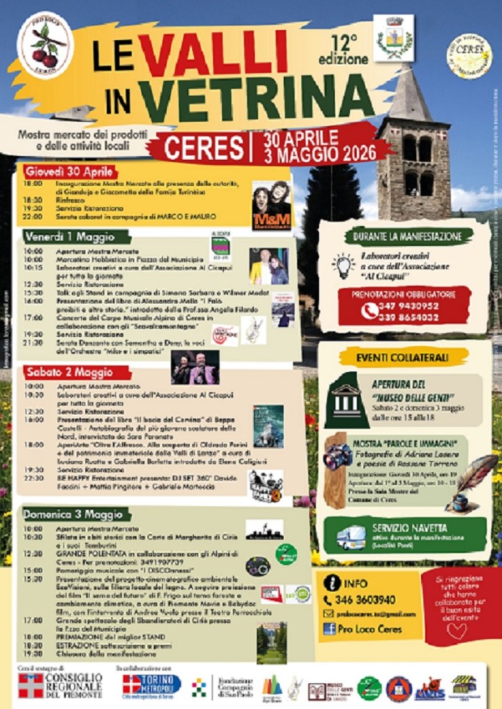 Da giovedì 30 aprile a domenica 3 maggio a Ceres saranno protagonisti l’artigianato e l’enogastronomia piemontese. Giunta alla 12ª edizione, la mostra mercato “Le Valli in Vetrina”, patrocinata e sostenuta dalla Città metropolitana di Torino attraverso il bando per la valorizzazione delle realtà territoriali, promette quattro giorni ricchi di eventi, cultura e sapori autentici, offrendo una panoramica completa delle attività locali e dei prodotti del territorio. Nell’edizione 2025 “Le Valli in Vetrina” ha richiamato oltre 2.000 visitatori al giorno e nella sola domenica di chiusura sono state servite oltre 300 razioni di polenta. La manifestazione è organizzata dalla Pro Loco in collaborazione con il Comune di Ceres e con il contributo di molti volontari.