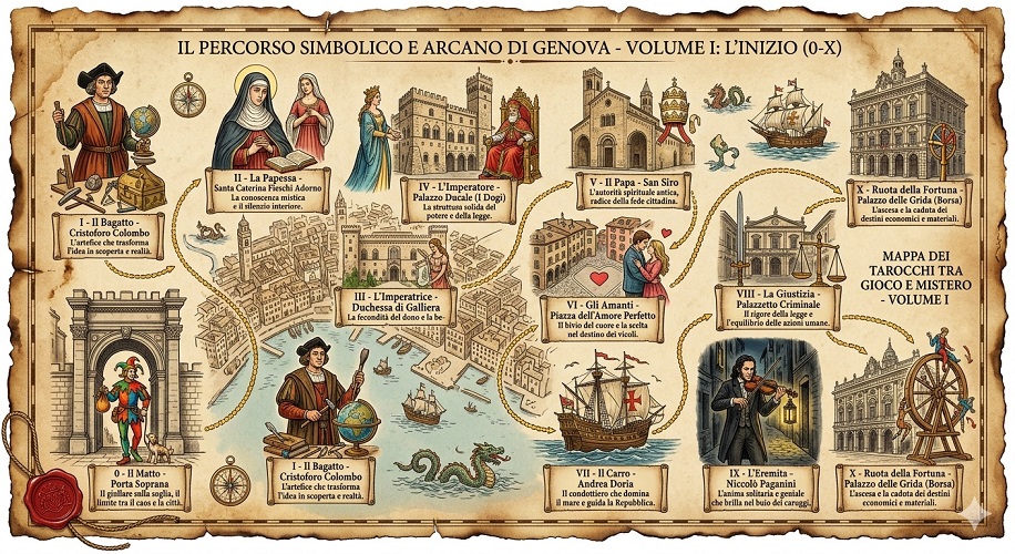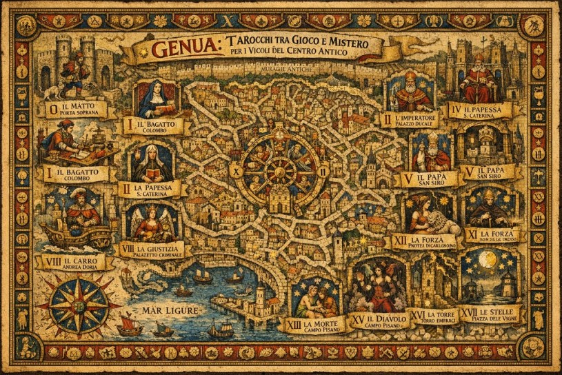 C’è una Genova che non si limita a essere guardata, ma che chiede di essere letta quasi come un libro aperto. È una città che invita a scoprire tesori d’arte e memorie stratificate nei secoli, ma che sa anche essere profondamente intrigante per chi decide di andare oltre la superficie. L’idea di questa visita guidata nasce proprio da qui: dalla voglia di proporre una passeggiata che non sia il solito tour turistico, ma un’immersione nel cuore della storia attraverso la lente dei Tarocchi.