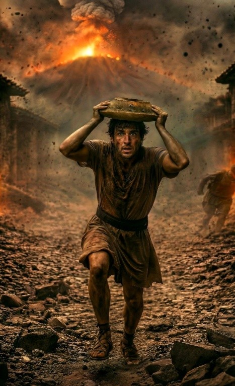 La ricostruzione riguarda un uomo morto durante l’eruzione del Vesuvio, che distrusse la città nel 79 d.C. in meno di 24 ore, ritrovato con un mortaio di terracotta, che sembra essere stato utilizzato come protezione durante la caduta di lapilli e frammenti vulcanici. Il gesto richiama le descrizioni di Plinio il Giovane, testimone oculare, che in una lettera riferisce come le persone in fuga dal vulcano cercassero di difendersi dal materiale eruttivo con oggetti o con cuscini legati sulla testa.